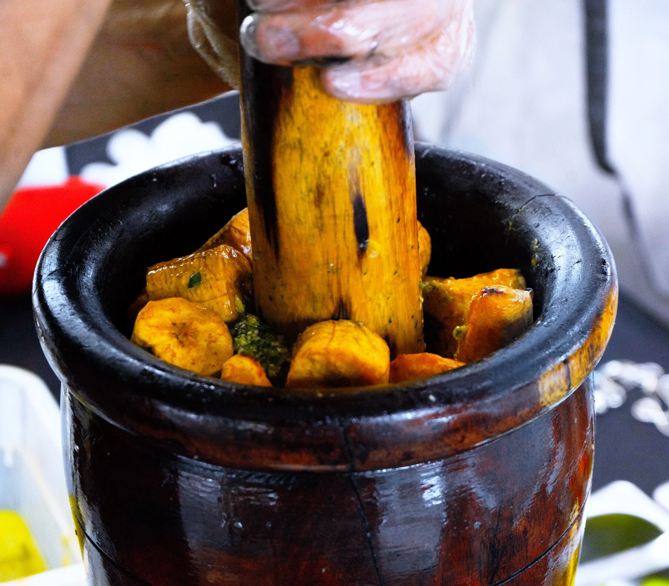 Green plantain as the main ingredient. Skin is peeled off, cut, then fried to perfection. Transferred into a mortar to get mashed with a secret blend of garlic, oil and spices until soft. It is molded and served hot with our special vegetable based vegan salsa criolla and more secret garlic mojo. Select your choice of proteins such as pork “carne frita”, guava chicken, sweet plantain aioli steak or our signature vegan protein “jackfruit guisado”.